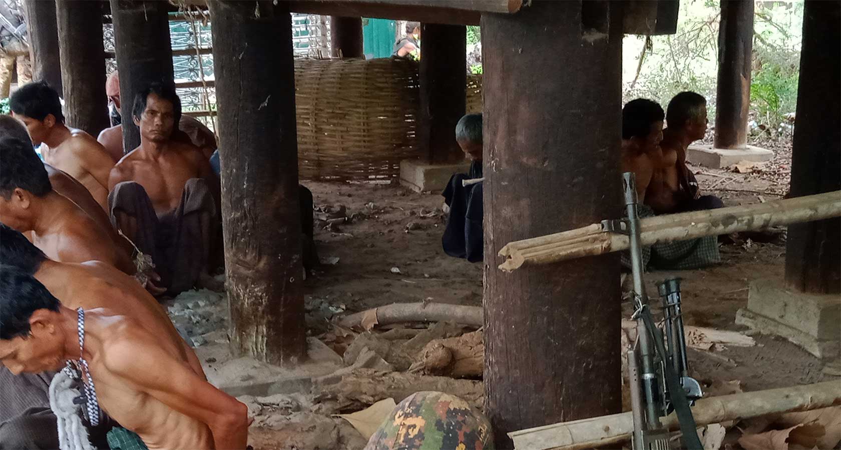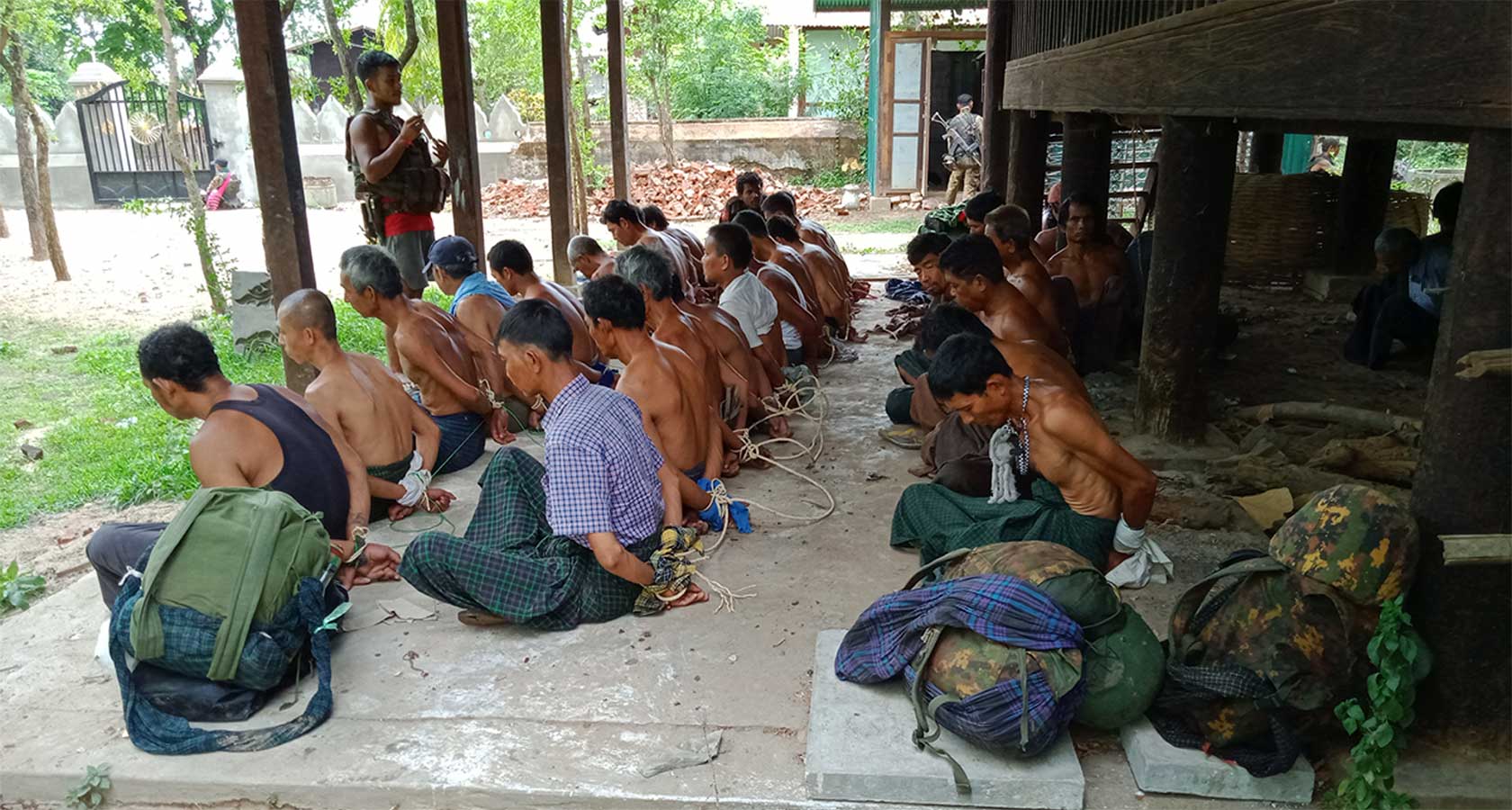 မုန်တိုင်ပင်ဘုန်းကြီးကျောင်းအတွင်း လက်နောက်ပြန်ကြိုးတုပ်ထားသည့် ရွာသားအယောက်သုံးဆယ်ခန့်အား တန်းစီထိုင်ခိုင်းထားသော ဓာတ်ပုံများကို စစ်ကောင်စီတပ်သား ကျကျန်ခဲ့သည့် ဖုန်းမှတစ်ဆင့် RFA က ရရှိခဲ့ပါသည်။ ကာယကံရှင်များ၏ မိသားစုများမှတစ်ဆင့် ရွာသား ၁၅ ယောက်ကို (ပုံတွင်နာမည်များဖြင့် ဖော်ပြထားသည်) မည်သူမည်ဝါဖြစ်ကြောင်း RFA က စုံစမ်းဖော်ထုတ် အတည်ပြုထားပါသည်။