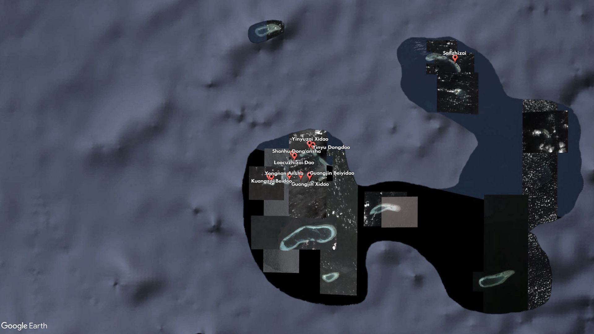 One of the new features, Sanzhizai, is a sandbar that satellite imagery shows to be uninhabited and barely above water at all hours. It is wedged between Middle Island and South Island, which are also unoccupied and claimed by China. China occupies all the inhabited features nearby, including North Island, which houses a small military outpost, and Tree Island, home to a larger port and military base.