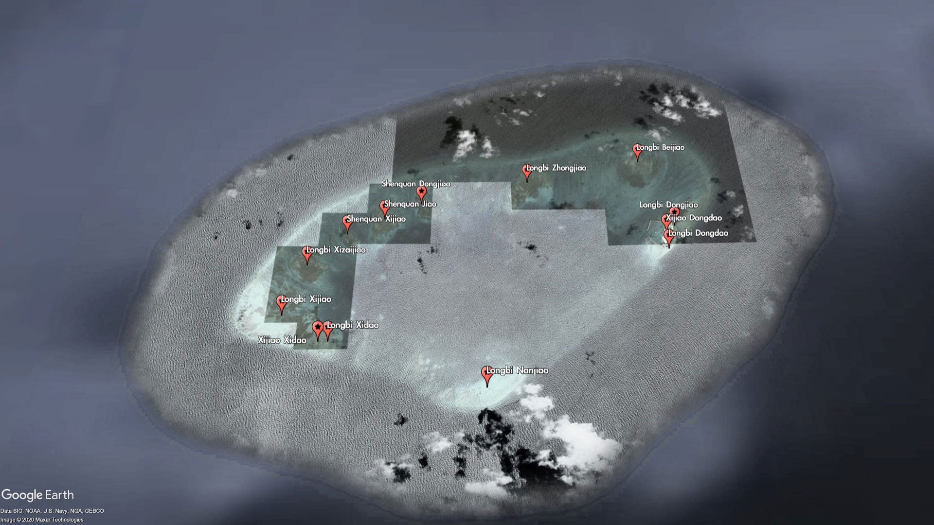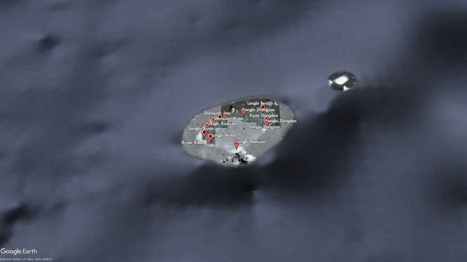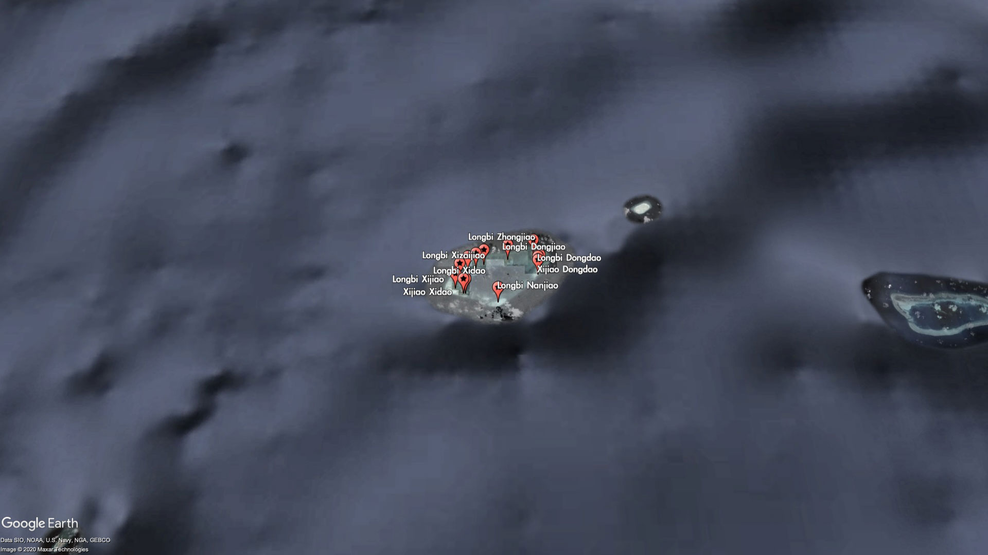 Other new features are clearly meant to plug the gaps between and around China's military outposts and artificial islands. Guangjin Beiyidao and Guangjin Bei'erdao (Guangjin North First Island and Guangjin North Second Island) are indistinguishable from each other, and China lists the same coordinates for both of them, but together with Guangjin Xidao (Guangjin West Island) they make up the small sand barrier on the western side of Duncan Island, which houses a Chinese-built harbor and outpost.