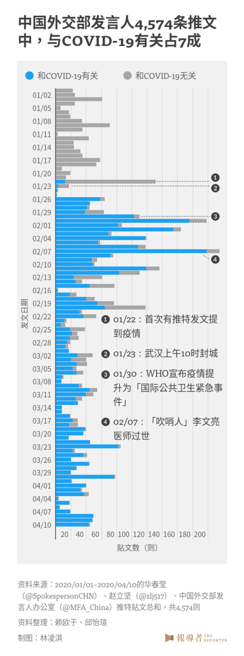 我们搜集中国外交部发言人华春莹(@SpokespersonCHN)、中国外交部发言人赵立坚(@zlj517)、中国外交部发言人办公室(@MFA_China)3个账号于2020年1月1日至4月10日在推特的发文数据,共计4,574笔,试图从中解析中国政府如何在社群媒体上谈论COVID-19疫情,透过中国的外交发言系统与发言人的发言频率、论述内容,来了解中国对外舆论塑造出的形象。